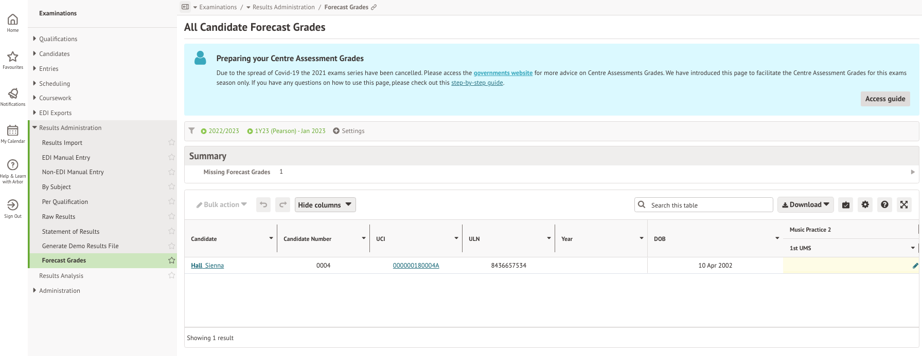 The Forecast Grades area of Results Administration was used to measure results during the 2020/2021 academic year when exam series' for that year were cancelled due to Covid. This page is not required for any current reporting, but it remains in place for legacy reporting.