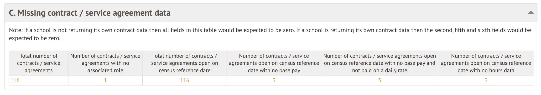 This table lists any staff profiles that are missing contracts or service agreements. This does not include staff members who have been excluded from the workforce census.