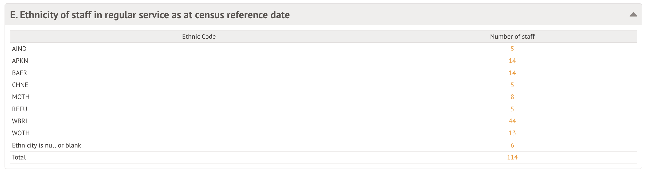 This table shows the number of staff who have an Ethnic Code recorded on their profile. If staff members do not have an Ethnic Code recorded, you can click the orange number in the Ethnicity is null or blank row and click on their name to go to their profile. From there, click on the Ethnicity field in the Identity section at the top of their profile and input the relevant information.
