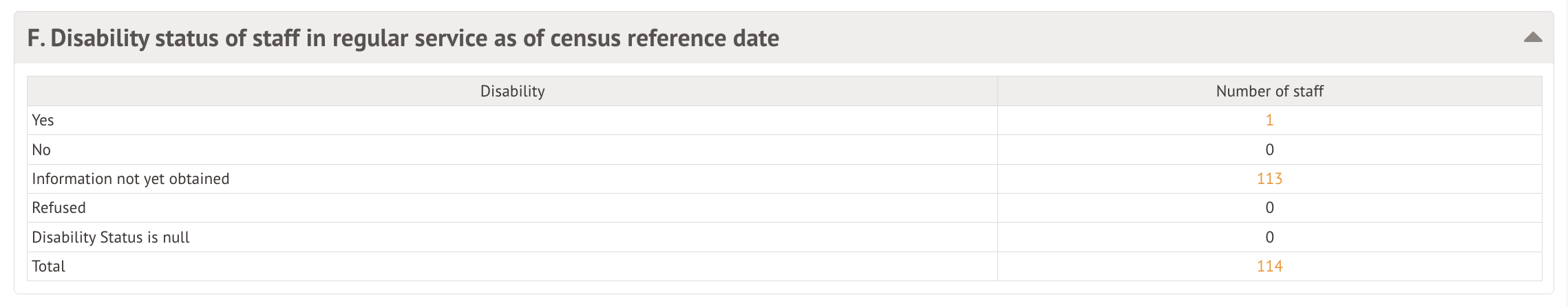 Table F: Disability status of staff in regular service as of census reference date