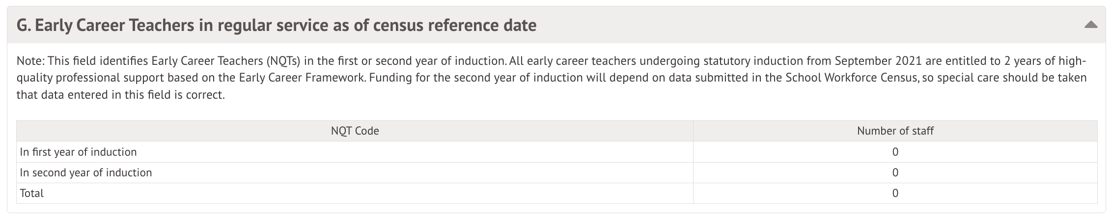 This table gathers information on staff members who are Newly Qualified Teachers (new teachers within their first two years). The table breaks down staff members in their first and second year of induction.
