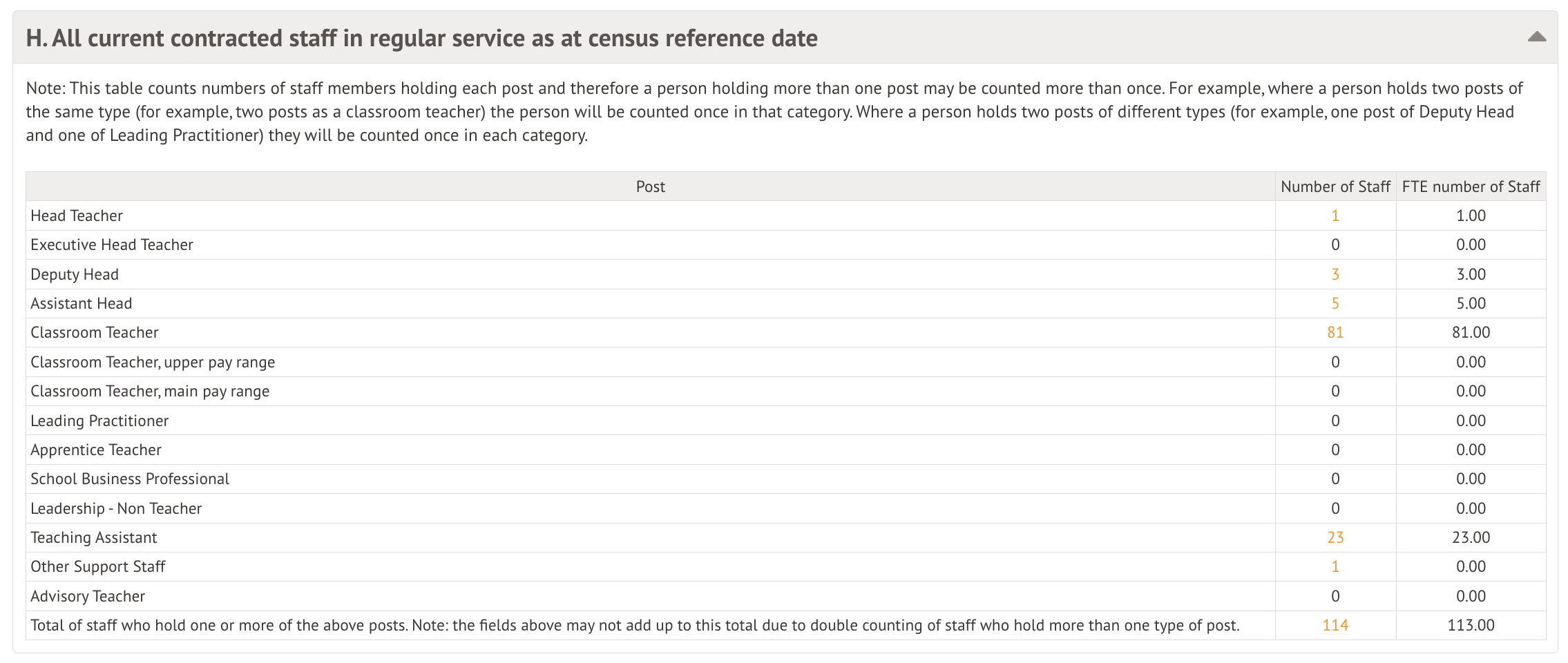 This table shows the number of staff members holding each post. If a staff member has more than one post, they will be recorded more than once.