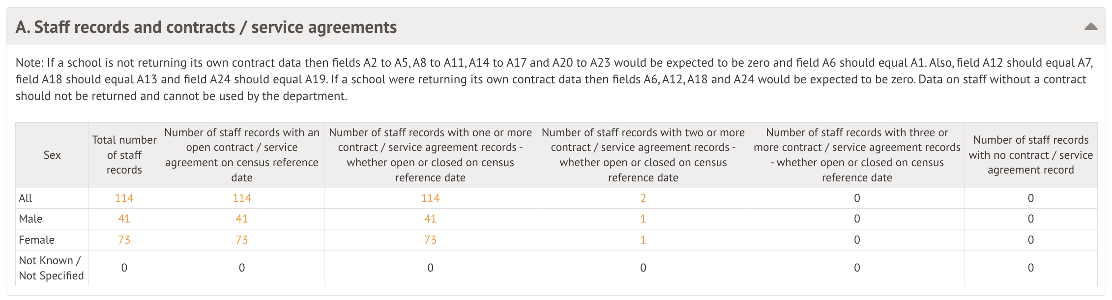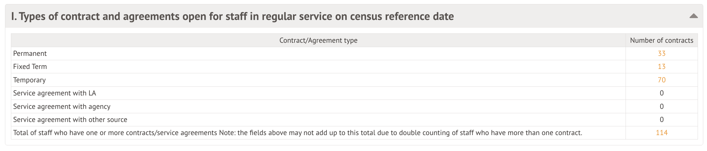 This table contains the basic details for your staff numbers, including total staff records and the number of contracts recorded.