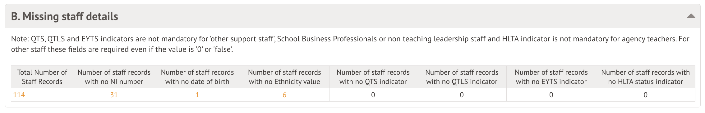 This table shows any staff members with personal details missing on their profiles. This does not include staff members who have been excluded from the workforce census.
