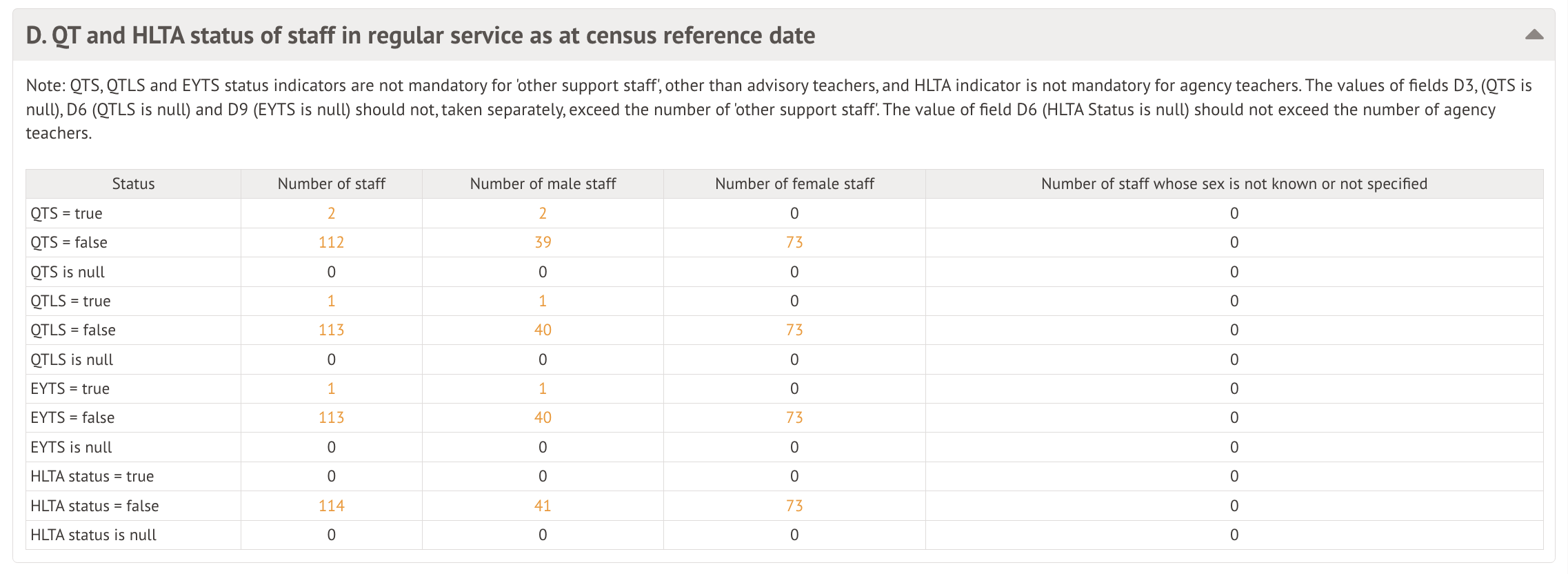 Table D: QT and HLTA status of staff in regular service as at census reference date