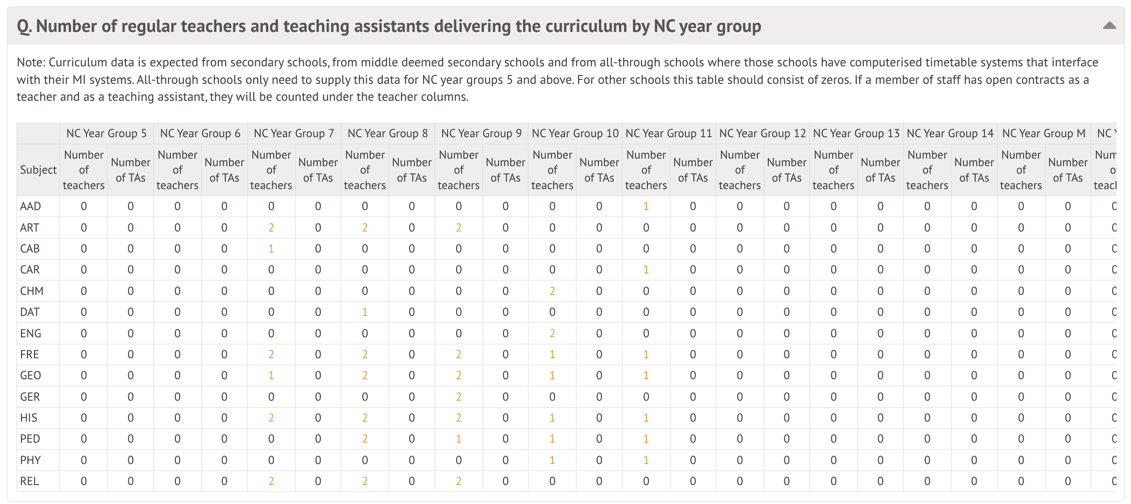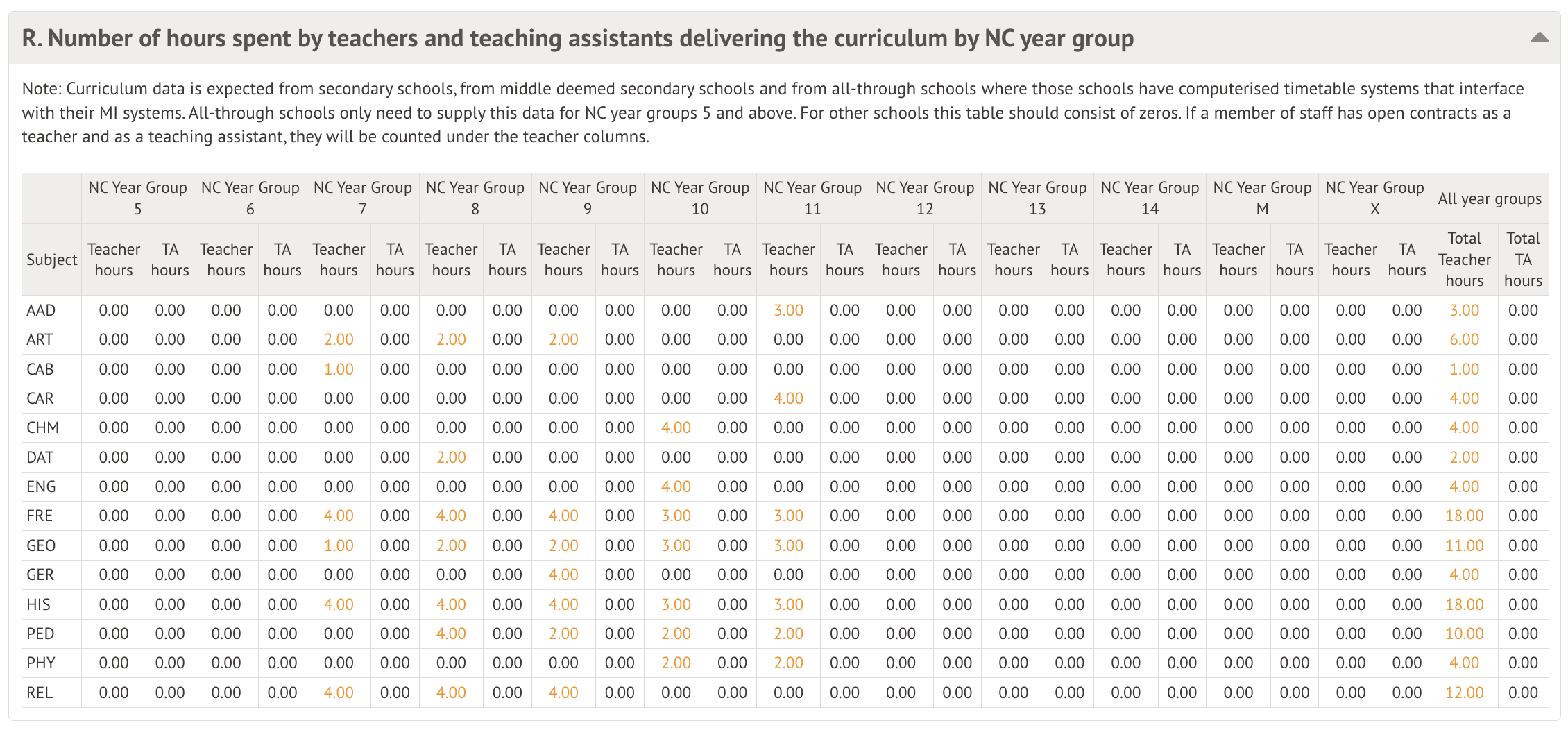 This table denotes the number of hours teaching staff have spent teaching the curriculum. Curriculum data is only collected from secondary schools, middle-deemed secondary schools and all-through schools. All-through schools only need to supply this data for NC year groups 5 and above, and any other school phase will display only 0's in this table.