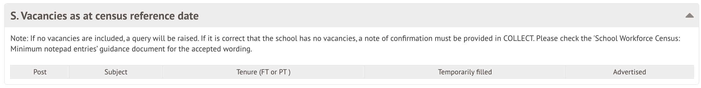 This table will show and posts where a vacancy is available. if you have no vacancies, it is expected for this to flag as a query in the workforce census and you would need to submit a validation note with your census.