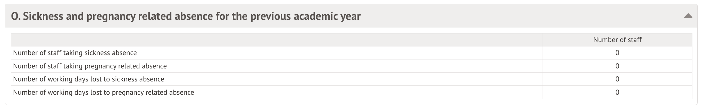 Table O: Sickness and pregnancy related absence for the previous academic year