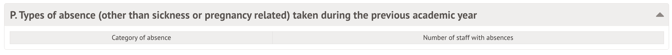 This table collects all other absences that are not from sickness or pregnancy that would otherwise be collected in Table O. This is only for teaching staff and not other administrative staff.