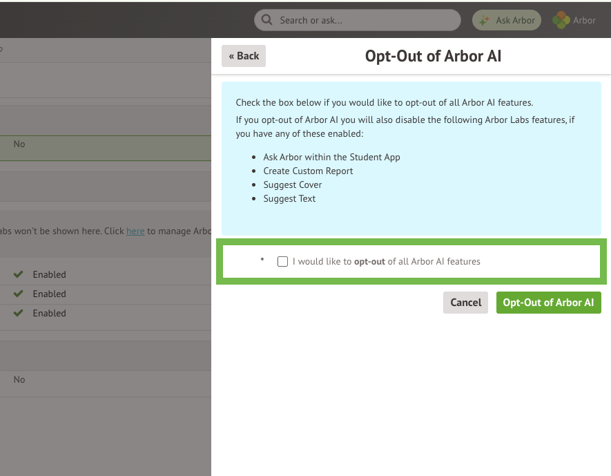 When you click on “Opt-out of Arbor AI”, a slide over will load. On the slide over, tick “I would like to opt-out of all Arbor AI features” and press the "Opt-Out of Arbor AI" button.