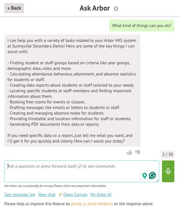 By default, Ask Arbor is enabled for administrators and leadership staff. Ask Arbor can be enabled for teaching staff, pastoral staff and other staff members if needed (see 'Opted out of Ask Arbor by default' below).