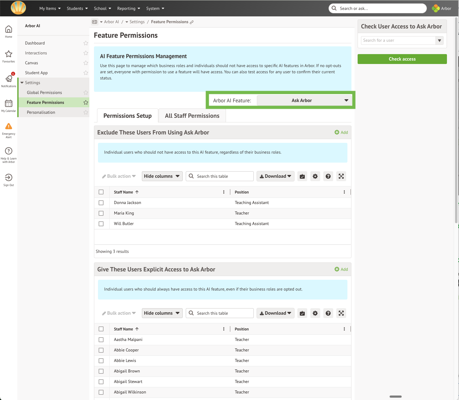 If you want to check access to the Arbor AI feature for an individual member of staff, select the staff member's name in the dropdown.