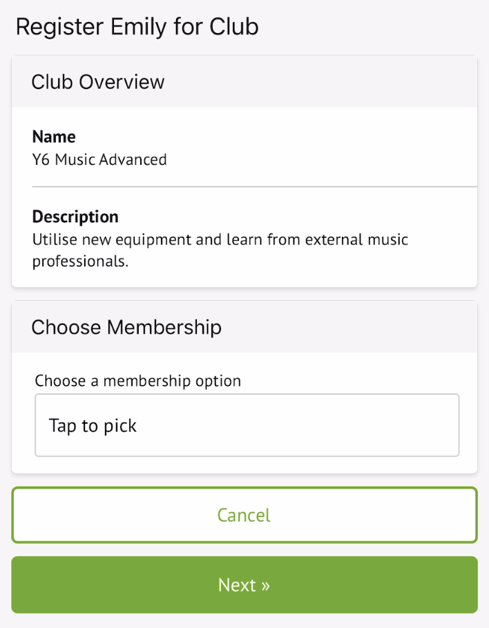 Select the club you would like to register for, then tap to pick the membership option you would like to sign your child up for and select Next