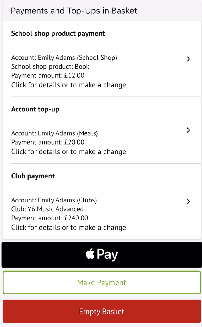 Tap the Google Pay or Apple Pay button (if your school has the relevant payments functionality enabled), or Make Payment to proceed to checkout