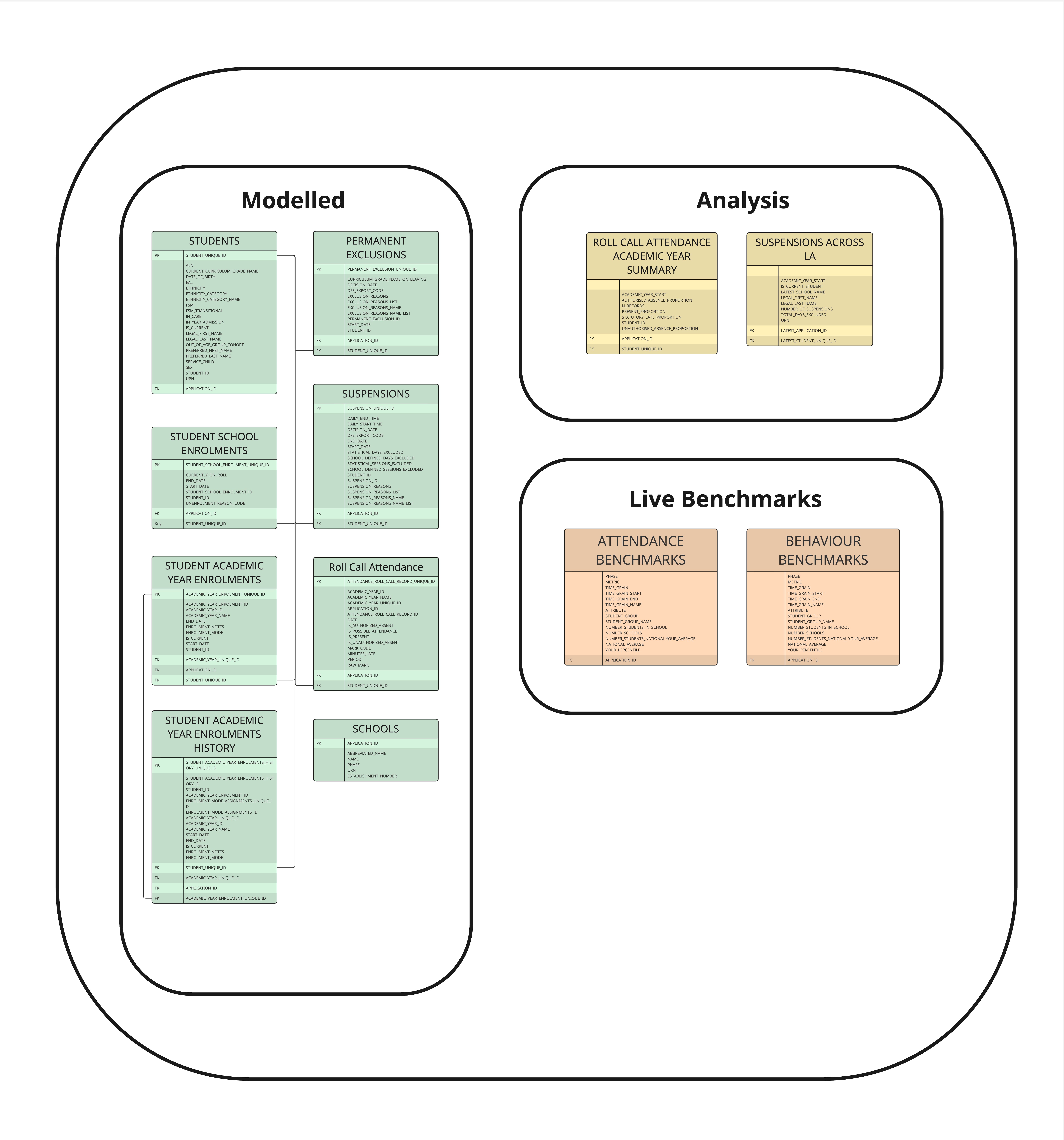 Datasets which support statutory reporting requirements are managed by requesting DfE Data. Modelled data for domains such as Attendance, Suspensions and Students are available in