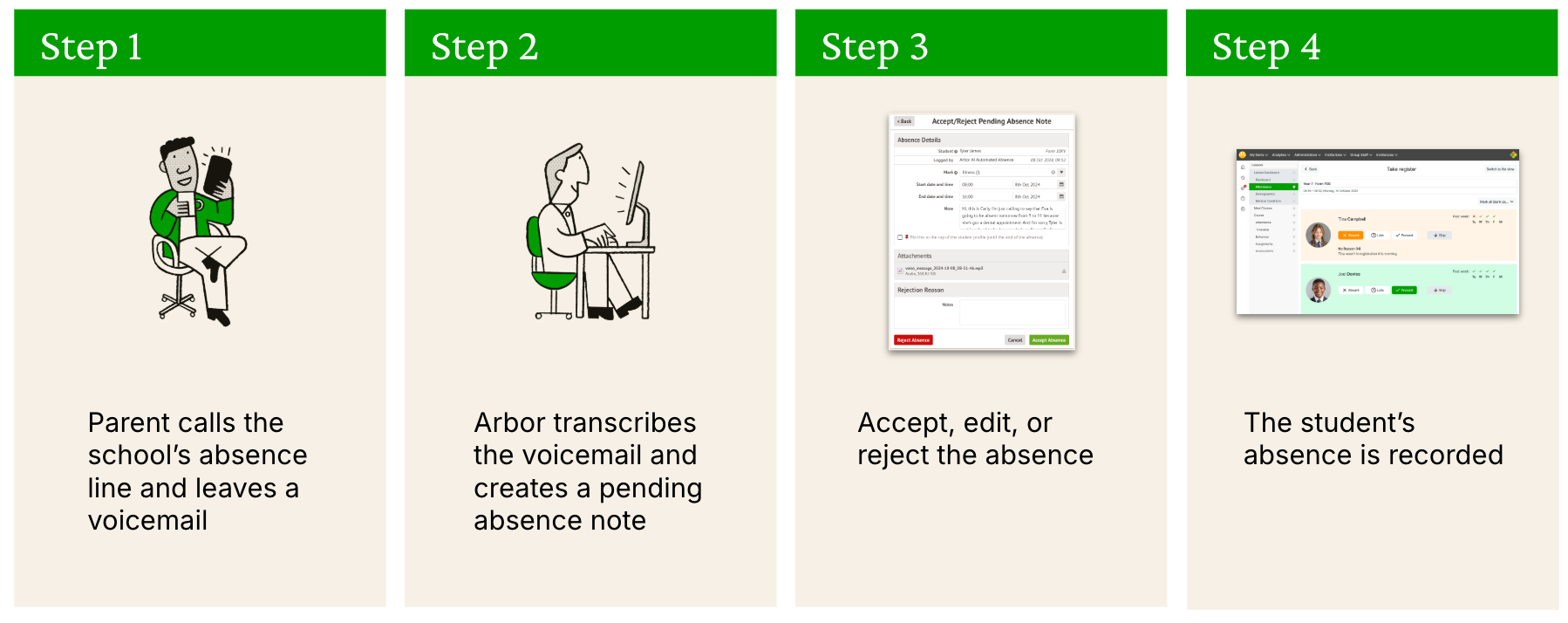 Arbor’s Auto Absence feature automatically creates pending absence notes from your parent or guardian's voicemails.Ā