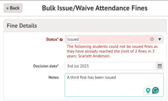 - Fine Limit Reached: If a student exceeds the fine limit, subsequent absences that meet the criteria will be set to pending and can only be Waived. Attempting to issue a third fine will result in a warning notifying you that the limit has been reached.