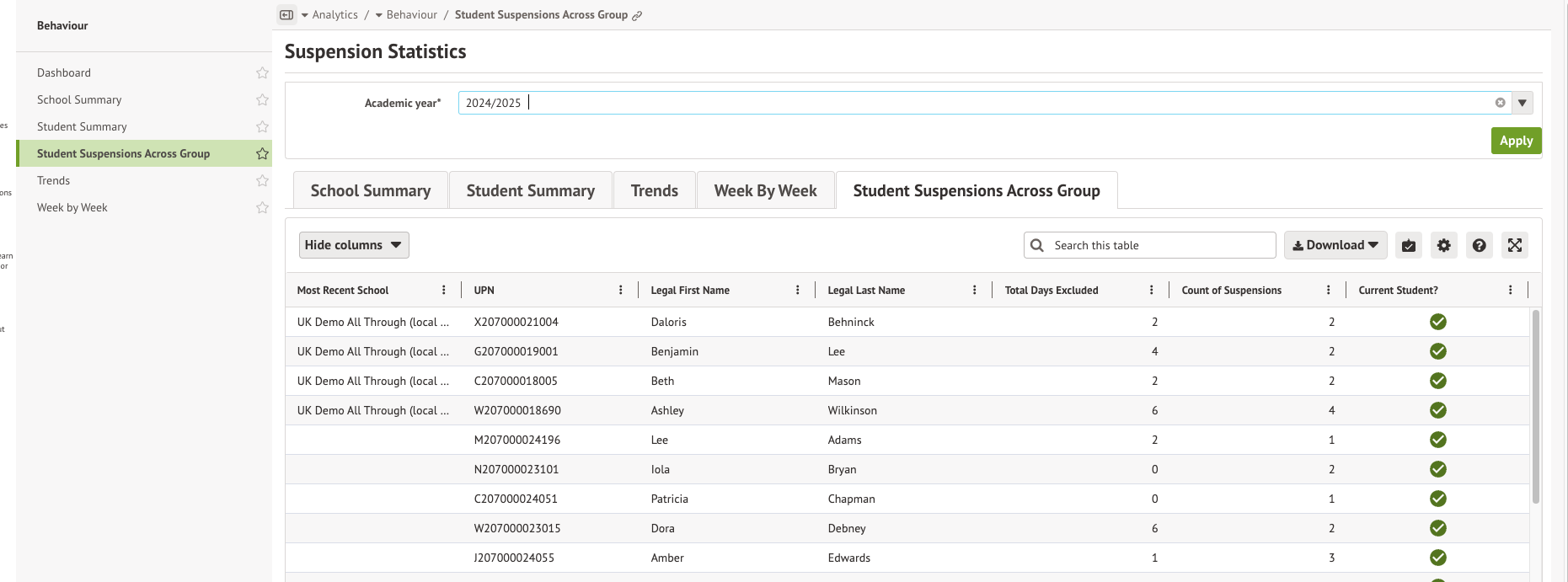 Contains a record for each student with at least one suspension in the academic year selected. It uses UPN to track student enrolments across all schools in the MAT or LA and provides a summary of all suspensions regardless of which school they were logged in. The school listed is the school with the latest enrolment record for the student.