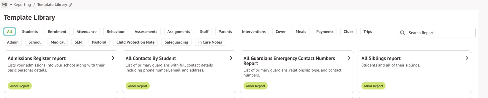 - Clickable categories at the top of the page for areas like Attendance, Behaviour and Assessments. Pressing these helps you filter and explore report templates across different areas in the list below the buttons.