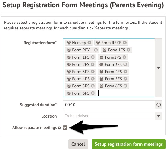 To allow separate meetings with each of a child's guardians, ensure that you keep the 'Allow separate meetings' box ticked when planning meetings with Form Tutors, Non-Form Tutors, or Course Leads.