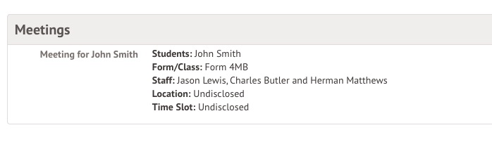 They will not see which guardian booked the meeting, nor will the time and location be disclosed, which will appear as Undisclosed. Only participants can view this information, even if guardians reside at the same address.