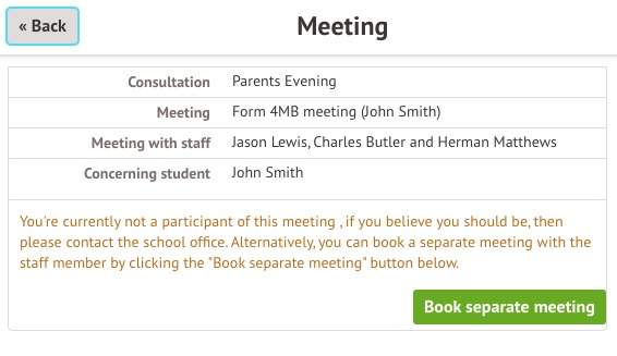 If Separate Meetings are allowed, a guardian excluded from an already booked meeting can select the undisclosed meeting and click Book Separate Meeting to book an additional meeting.
