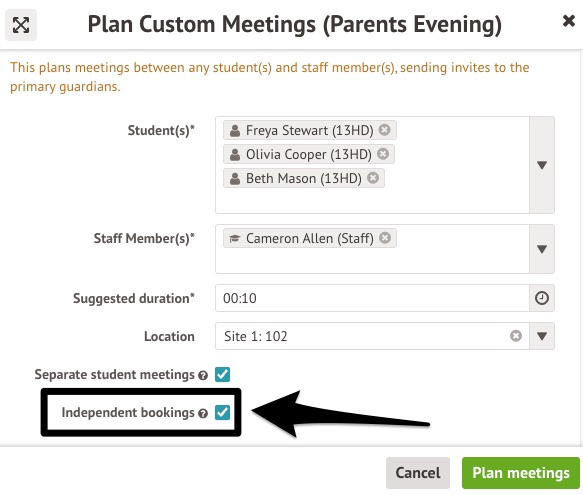 If you want parents to be able to book separate meetings for their child with the same teacher(s), ensure that you decide this when planning your meetings initially (see Adding Meetings guidance).