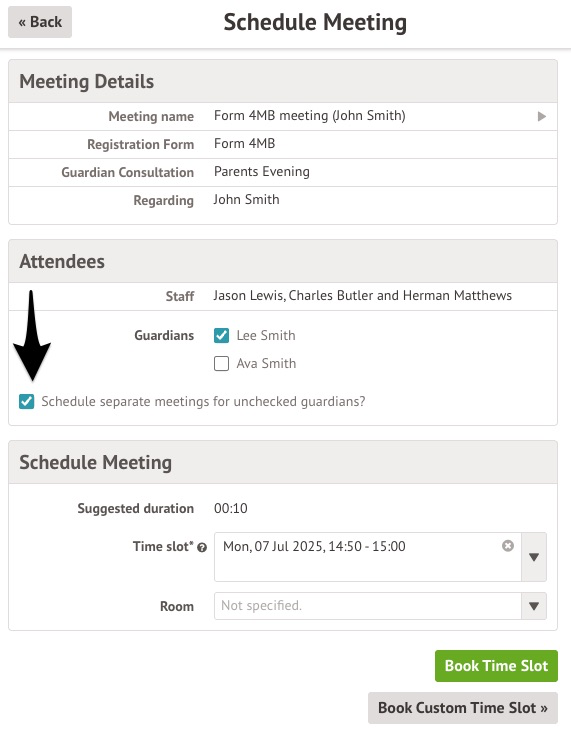 Selecting this box will create a new bookable meeting for unticked guardians. The ticked guardian will not be automatically added to this second meeting.