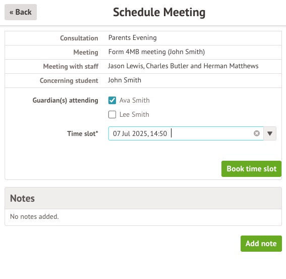 When guardians book a consultation meeting on the Parent Portal or App, they select which guardians will attend.