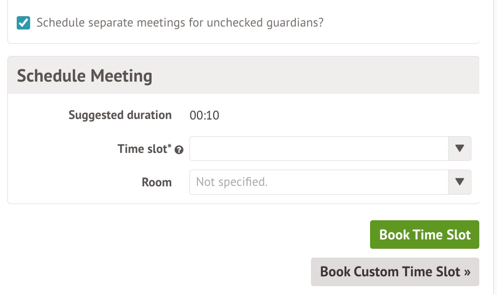 The first is that if a student has multiple primary guardians, when you go to manually book their meeting, you see a Schedule separate meetings for unchecked guardians? tickbox if the meeting has not yet been scheduled.