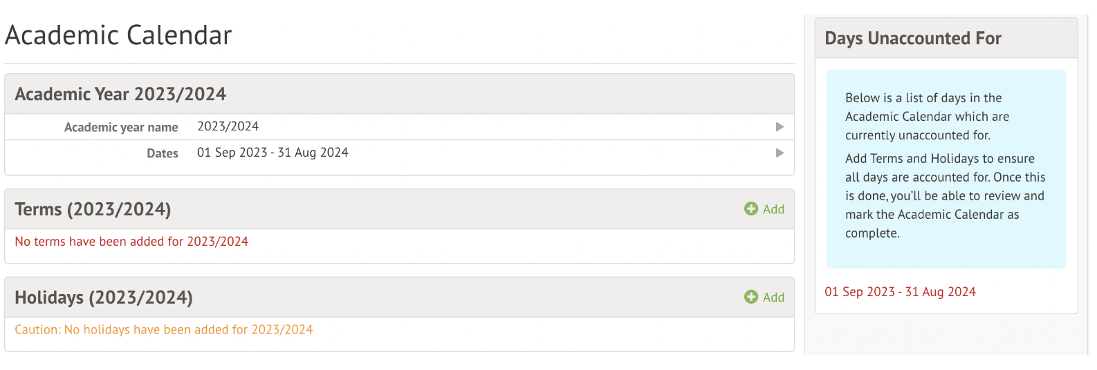 - Requirement: All dates in the academic year must be covered by either terms or holidays to ensure correct register creation and to mark the step as complete.
