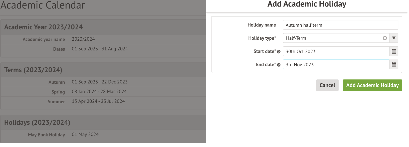 - A: This message typically appears when you try to add a 'Half-term' holiday type with dates that fall outside of an existing term.