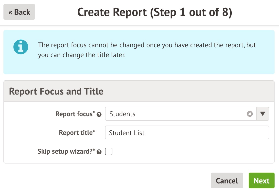• Select a Report Focus using the drop-down - this is the main subject of your report, for example, students, staff or courses/classes.