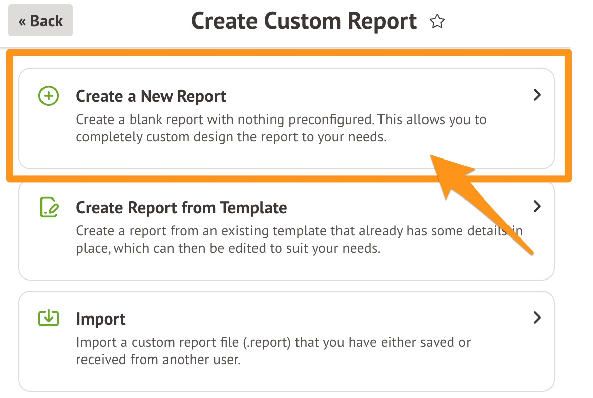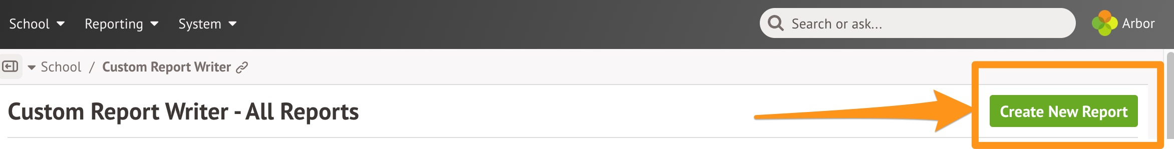 • Click the green Create New Report button in the top right corner of the School > Custom Report Writer page (see image above).
