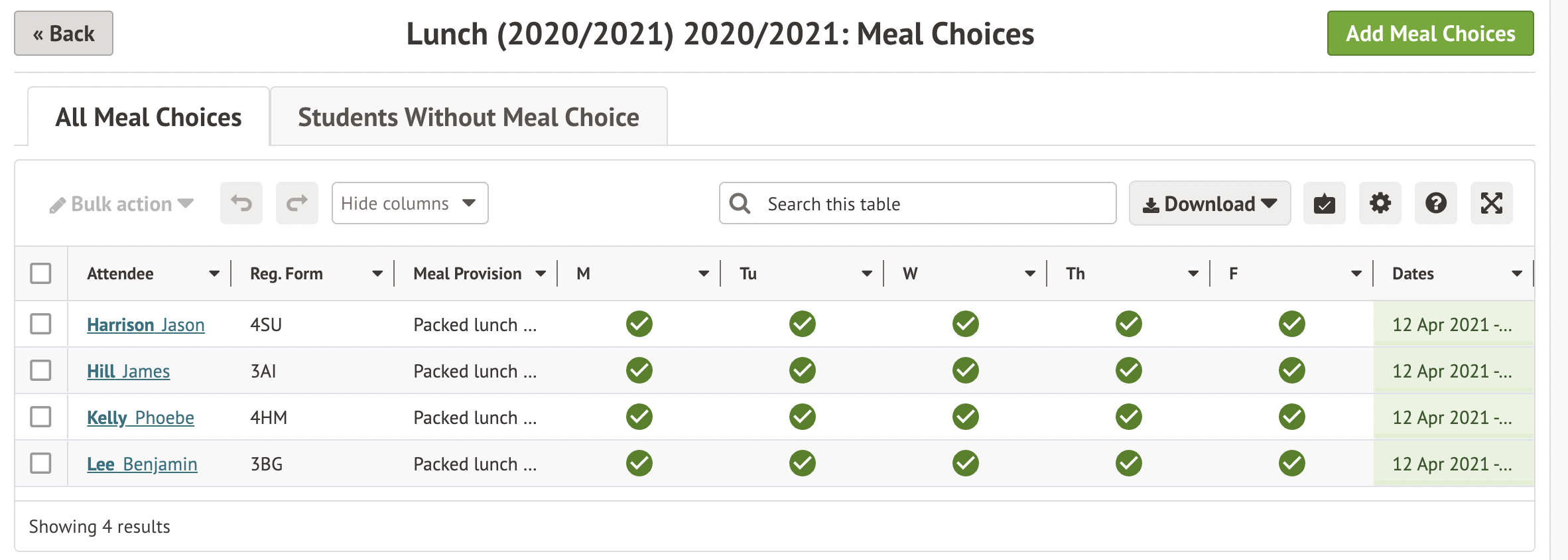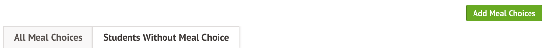 - Click the green "Add Meal Choices" button in the top-right corner, or use the tick boxes to select specific students from the table and then use the "Bulk Action" button to Add a Meal Choice.