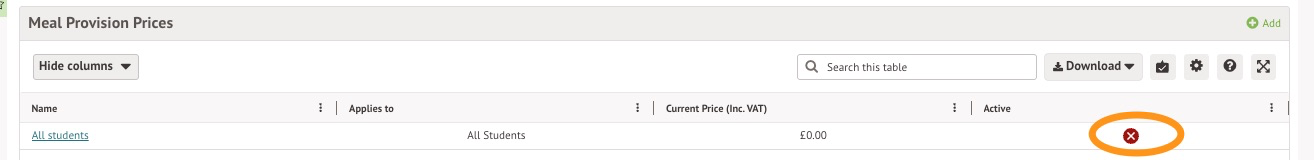 Why do my prices have an 'X' next to them in the Meal Provision Prices in the Active column?