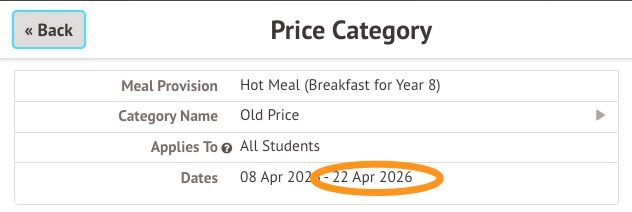 To get back to your list of provisions, use the grey Back button on the top-left corner or head to School > Meals > [on the left-hand side] Setup and click on Prices.
