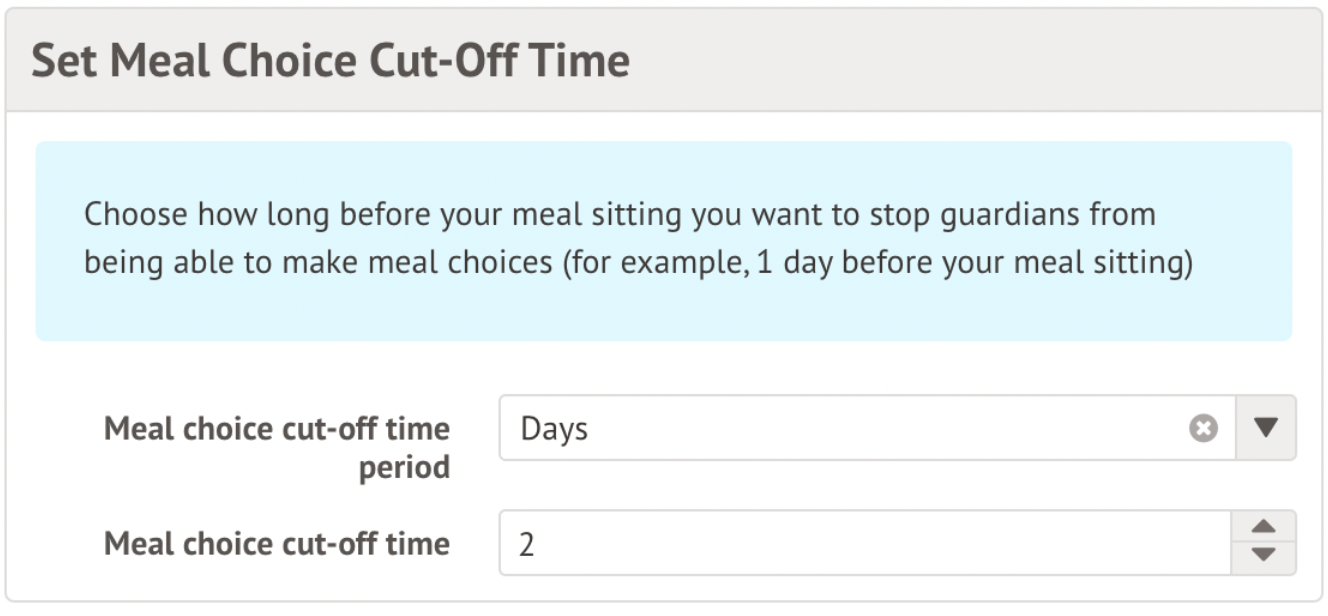 The Meal choice cut-off time period and cut-off time fields work together, allowing you to select hours, days, or weeks, along with a specific number.