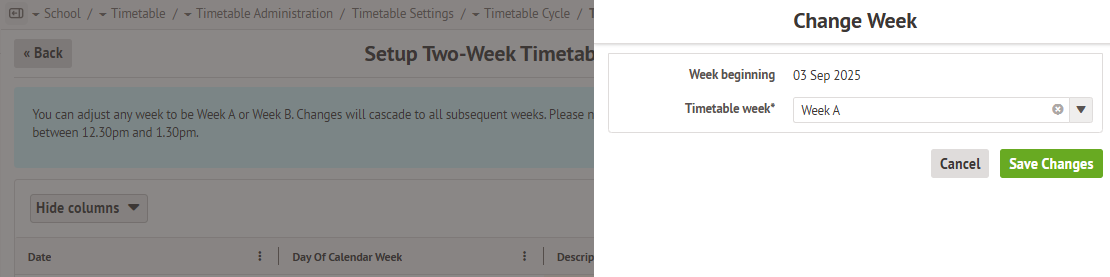 Note: Ensure you want a two-week timetable, as reversing this option requires contacting us. Only one or two-week timetables are supported.