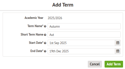 Note: You can set terms for any dates, either as full terms or split into halves. Holidays are recorded separately, and terms can include or exclude holiday dates.