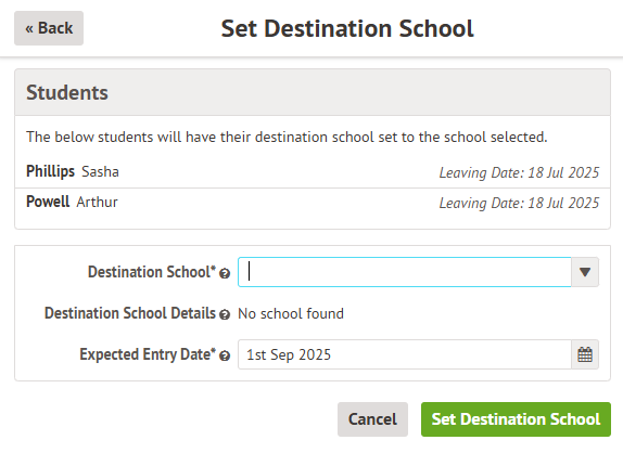 - From the dropdown, select the Destination School and Expected Entry Date, then click "Set Destination School".