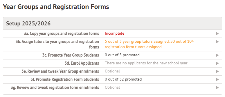 To access this, go to: School > School Structure > School Year Setup. This will take you to a checklist with each of the school year setup stages.