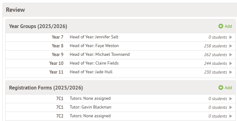 If your Year Groups and Registration Forms have migrated, view them in the "Review" lists. If students are allocated to these groups, you can see the total enrolments. Click on each group for a list of enrolled students, including those without enrolments. Note: Applicants cannot be migrated with group memberships and must be added at the end of the School Year Setup process. This means that Year 7 groups will not show as having any members.