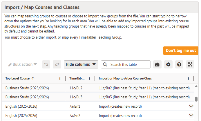 Top Tip: In the above image you will see a "Don’t log me out" button. Ensure that this has been clicked to prevent a system log out. If you are logged out during this process, all changes from this step will be lost.