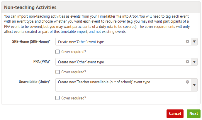 In this step, you can import any Non-teaching Activities (NTAs) you've set up in TimeTabler. This can include Guaranteed Planning, Preparation and Assessment (PPA) Time, meetings or other types of events. They will be imported as Events in Arbor.