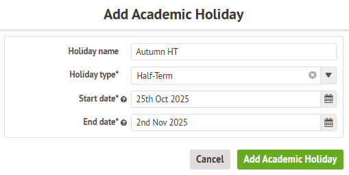 - Finally, create academic holidays by clicking "Add" next to Holidays. Enter the holiday name, type, and dates, covering only the teaching days. Repeat for each half-term, holiday, bank holiday, and INSET day.