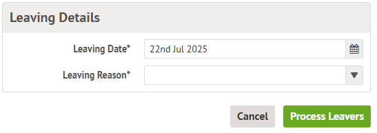 - Select a leaving date and a leaving reason, and then click "Process Leavers". Note: This step can be repeated multiple times if you need to enter a different leaving reason or date for different groups of students.