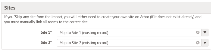 The import wizard creates a new record if no match is found in Arbor. Use the dropdown to map to a different record or skip the import (Note: Skipped sites or rooms will not be imported).