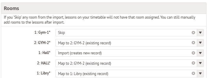 If a site or room exists, the wizard will try to map it to your timetable file. Ensure all mappings are correct before proceeding. Use the dropdown to re-map, skip, or create a new record.