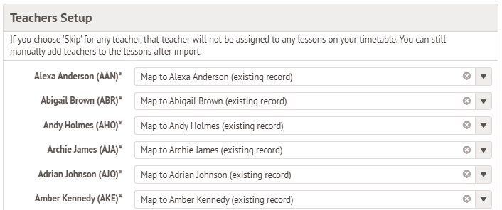 If the group exists, the import wizard will try to match it with your timetable file. Verify that each mapped group is correct before moving on. Use the dropdown to re-map, skip, or create a new record. Note: Duplicates may occur if a new group is created when the original already exists.